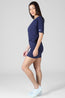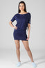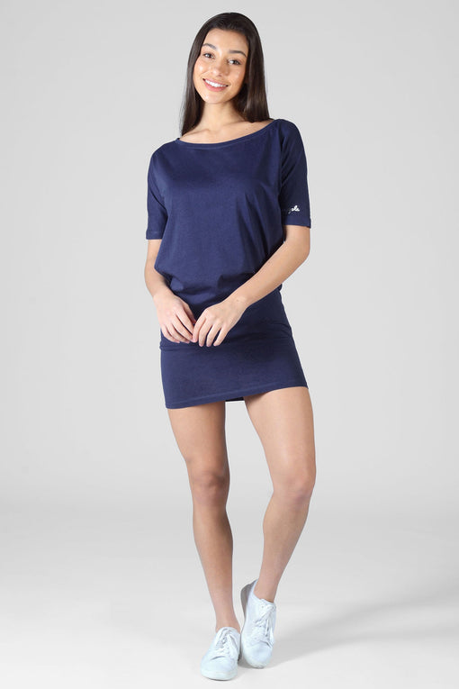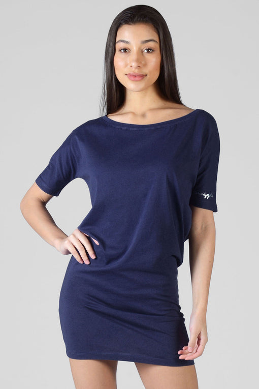 Pineapple navy blue day dress in a soft cotton jersey fabric with a small logo print on the sleeve cuff. This casual dress for women can be worn on shoulder for a relaxed lounge look off shoulder with a pair of heels to a fun night out!